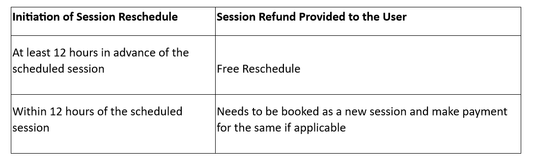 Within 6 hours of the scheduled session | Needs to be booked as a new session and make payment for the same if applicable |
