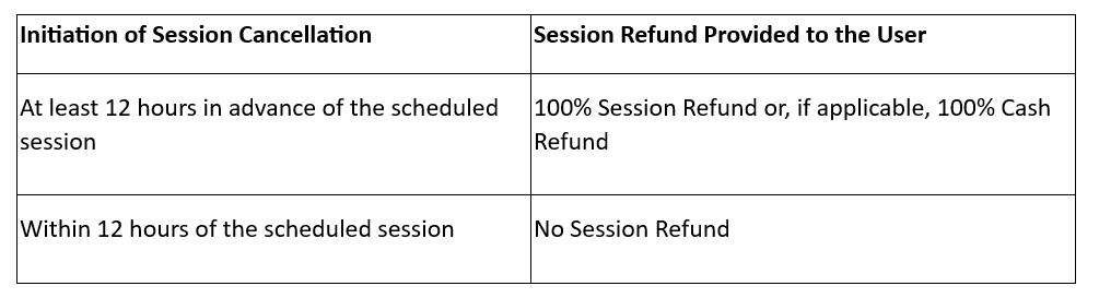 Users have the ability to cancel a session and seek a refund in the form of a Session Refund. The amount refunded depends on the timing of the cancellation request, as shown in the table below.